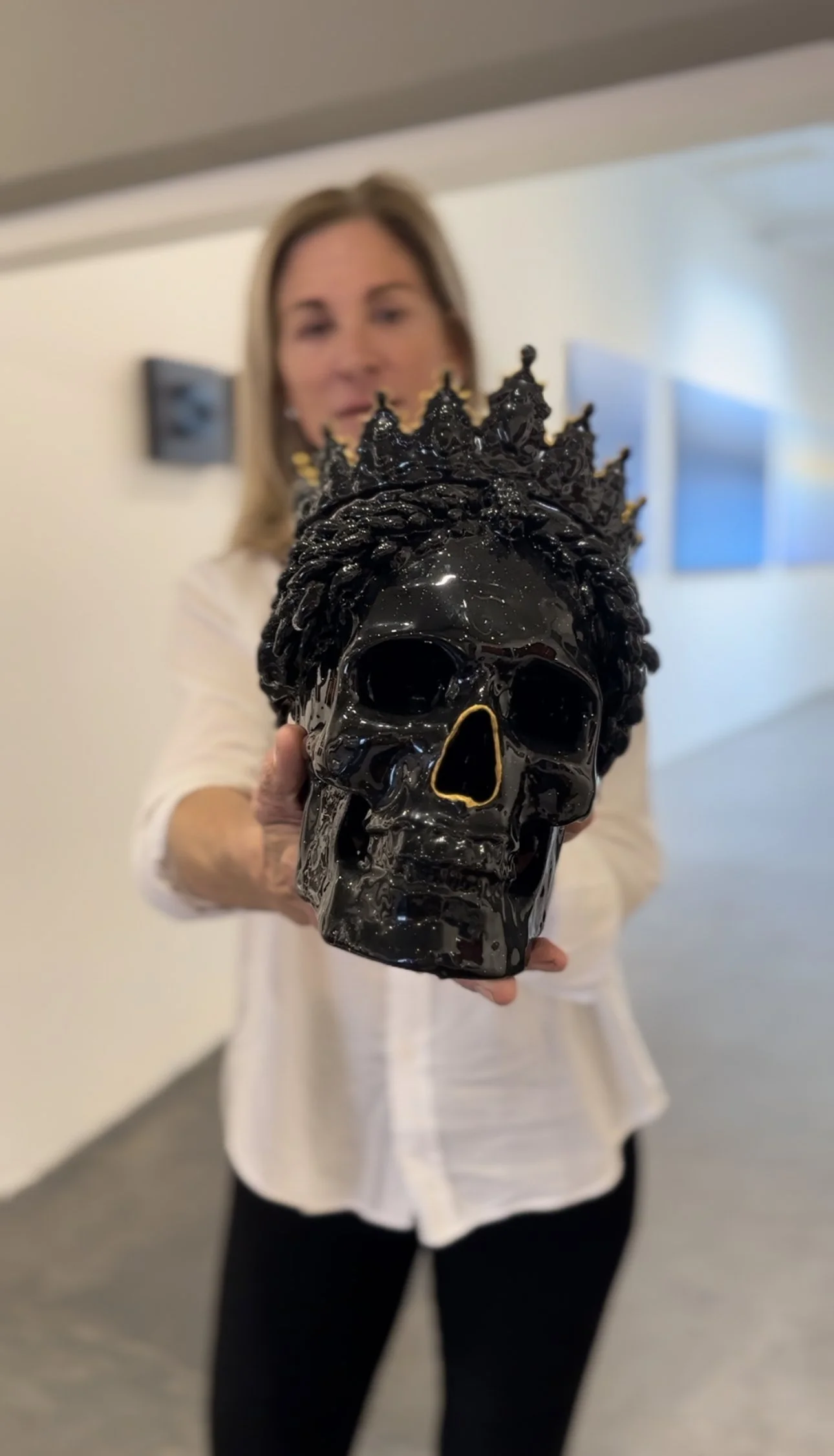 Often covering them in gold leaf. The skulls come from my reflections about our corporal existence in life. What’s more illustrative of that than our heads which cradle our thoughts? They are whimsical and I get to have fun with them. “Queen for a Day, “King of the Hill”. Who doesn’t know a man or a woman ( or maybe themself) that they can’t attribute this to?